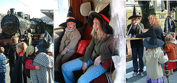Harry Potter Fieber machte auch vor Eberbach nicht Halt Da staunten die "Muggel" in Eberbach als der Hogwarts-Express, voll besetzt mit Hexen und Zauberern, im Bahnhof einfuhr. (Fotos:Wörner)(tw) (tf)Pünktlich zum Erscheinen der mit Spannung erwarteten deutschen Ausgabe des 5. Bandes von Harry Potter machte der legendäre Zug aus der berühmten Romanreihe, der Hogwarts-Express, am Samstag Station am Eberbacher Bahnhof. Möglich gemacht wurde dieser "prominente Besuch" durch die Buchhandlung am Käfertörle in Mosbach und die Buchhandlung Greif in Eberbach. Hunderte von verkleideten Harry-Potter-Fans empfingen die nostalgische Dampflok mit ihren vier Waggons, die am Morgen ihre Fahrt von Heilbronn über Mosbach nach Eberbach angetreten hatte, am Bahnsteig 9 ¾. Langeweile kam nicht auf während der dreiviertelstündigen Aufenthaltszeit. Kinder wie Erwachsene bestaunten das Manöver des Lokführers, der die Lokomotive aus- und am anderen Ende wieder ankoppeln musste, um die Rückfahrt, die wieder über Mosbach führte, antreten zu können, und wurden mit "magischem" Gebäck einer Mosbacher Bäckerei und den ebenfalls in den Romanen vorkommenden "Bertie Bott’s Bohnen" versorgt. Pünktlich um 13.08 Uhr verließ der Zug dann schnaubend und dampfend und mit fröhlichen, aus den Fenstern winkenden Kindern unsere Stadt.