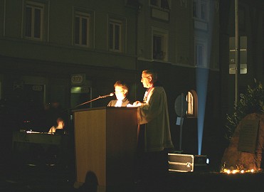Mehr als 100 Bürgerinnen und Bürger versammelten sich am Gedenkstein für die in der Nacht vom 9.November 1938 durch die Nationalsozialisten zerstörte Synagoge an der Ecke Brückenstraße / Adolf-Knecht-Straße. An den vier Ecken des Platzes waren "Scanner" aufgebaut, deren Lichtstrahlen in der Finsternis eindrucksvoll das ehemalige jüdische Gotteshaus symbolisierten.