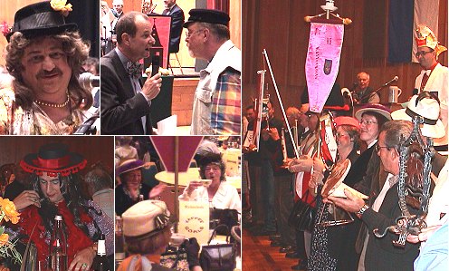 Stammtisch-Lobby startet in die närrische Kampagne Rechts Sitzungspräsident Ralph Brenneis mit den versammelten Wimpelträgern der Stammtische, Mitte oben Bruno Schmitt (l.) im Gespräch mit "Zechpreller" Dieter Müller. Übrige Fotos: einige Stammtischschwestern. (Fotos:Richter)(hr) Der notleidenden Eberbacher Stammtische hat sich jetzt die Karnevalgesellschaft Kuckuck (KGK) angenommen. Viele Stammtischschwestern und -brüder folgten dem Ruf der närrischen Zunft und strömten am Abend des gestrigen 11.11. in den Großen Saal der Stadthalle. Darunter waren namhafte Tafelrunden wie die Reservisten, die Eisenbahnfreunde, die Wiesensträßler, der MGV Liederkranz, die Freiwillige Feuerwehr oder der Fanfarenzug, aber auch eher unbekannte, dafür um so illustrere Teams wir die Damen vom Stammtisch "Geschmähte Rose" (die allesamt Herren waren), die behüteten "Kaffee Görls" oder die rustikalen "Kuckucksfresser", die nicht etwa aus Wimmersbach sondern aus Rockenau vom Club Eulenspiegel kamen. Kuckucks-Präsident Dieter Müller von den "Zechprellern" kam sogar solo und nahm kurzerhand am Tisch der Ehrengäste Platz, wo sich neben Stadträtinnen und Stadträten auch der Schönbrunner Bürgermeister Roland Schilling und Kreisrat Manfred Wernz niedergelassen hatten.
