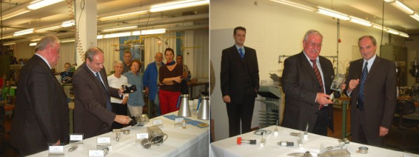 Anlässlich des fünfjährigen Firmenjubiläums informierten sich Bürgermeister Roland Schilling, Karl Wilhelm und Karl- Heinz Wagner bei der innovativen Firma über die in Moosbrunn hergestellten Produkte. Besonders stolz ist Richard Pinter auf einen Präzisionsdruckschalter, der in Kernspintomographen eingesetzt wird.