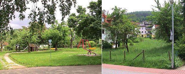 Spielplatz in der Scheffelstraße wird verlegt Links das jetztige Spielplatzareal, rechts das Ausweich-Grundstück in der Scheffelstraße. Die Fotos entstanden im Mai dieses Jahres. (Fotos:Richter)(hr) Der Verlegung des Spielplatzes in der Scheffelstraße stimmte vorgestern der Bauausschuss des Eberbacher Gemeinderats mit großer Mehrheit zu. Auf dem frei werdenden Areal könne dann eine "lockere, durchgrünte Wohnbebauung" entstehen, meinte Bauamtsleiter Manfred Janner. Über dahingehende Planungen wurde im Bauausschuss hinter verschlossenen Türen debattiert. Der Gemeinderat soll in öffentlicher Sitzung am 27.November dazu Beschlüsse fassen. Neben der geplanten Wohnanlage waren Lärmbelästigungen der Anwohner, nächtliche Treffen Jugendlicher auf dem schlecht einsehbaren Spielplatz sowie die hohen Unterhaltungskosten aufgrund des schlechten Zustands und der Größe des Areals Argumente für die Verlegung. Ein Ausweichgelände, kleiner als der jetzige Spielplatz, hat die Stadtverwaltung nur wenige Meter entfernt direkt neben dem Katholischen Kindergarten in der Scheffelstraße gefunden.