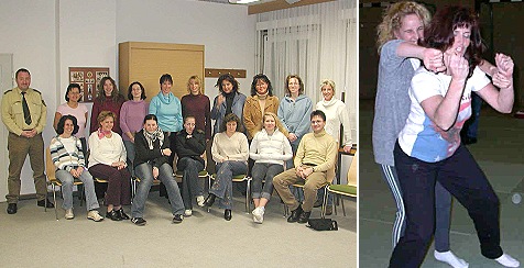 An den zwei aufeinanderfolgenden Dienstagen standen für jeweils drei Stunden neben Notwehrrecht und einfachen Verteidigungstechniken vor allem das mentale Durchspielen von bedrohlichen Situationen im Mittelpunkt. Im mentalen Training findet sich der Weg, Gedanken der Angst in Aufmerksamkeit zu transferieren und eine bewusste Entscheidung zwischen einem Reiz und der Reaktion darauf zu treffen. Gleichzeitig suggeriert eine aufmerksame Körpersprache einem potentiellen Angreifer, dass er Schwierigkeiten haben wird. Die Opferrolle wird hierdurch einfach ausgelassen und ein Angriff, der nicht stattfindet, muss auch nicht abgewehrt werden. Und für den Fall der Fälle übten die Teilnehmerinnen, ihre Kraft mit einer effektiven Technik auf den richtigen Zeitpunkt und die richtige Gelegenheit zu bündeln. Die Polizeihauptmeister Bernd Grimm und Günter Frey verstehen es, einen geschützten Raum zu schaffen in dem Frauen offen ihre Erfahrungen austauschen und über Ängste und Angsträume sprechen.