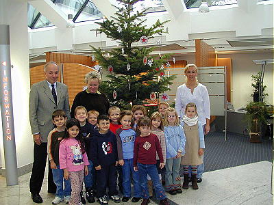 Sparkassenkundenhalle weihnachtlich geschmückt Das Bild zeigt die Kinder und den selbstgeschmückten Weihnachtsbaum, die Betreuerinnen Frau Kraus und Frau Ackermann sowie Direktor Wolfgang Kleeberger von der Sparkasse.