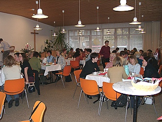 Adventliches Frauenfrühstück im Haus Arche (Foto: privat)(bro) (ct) Am Samstag vor dem 1. Advent trafen sich insgesamt 56 Frauen aus Eberbach und Umgebung im Haus der Gemeinschaft in der evangelischen Kirche in der Friedrich-Ebert-Straße. Nach einem ausgiebigen Frühstücksbüfett hielt Ilse Wahl einen Vortrag über DISG, ein Modell seine Persönlichkeit zu entdecken, um dann das Miteinander in Ehe, Familie, Beruf und Gemeinde zu verbessern. Sie verdeutlichte die vier Buchstaben D-Dominant, I- Innovativ, S-Stetig und G- Gewissenhaft auch anhand von biblischen Gestalten. Leider war in dem zeitlichen Rahmen nur ein grobes Anreißen des Themas möglich, aber so manch einer wurde angeregt, sich näher damit zu beschäftigen. Entsprechende Literatur wurde vorgestellt. Diese kann unter Tel. (06262) 6961 bestellt werden. Die Mitarbeiterinnen rund um Frau Sabine Bund waren mit dem Vormittag sehr zufrieden und planen zwei weitere Frauenfrühstücke für das nächste Jahr.