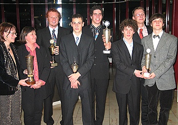 Ehrungen standen im Mittelpunkt Mit Pokalen wurden Mitglieder der Rennmannschaft sowie die Trainerinnen der Kindergruppe Edith Sterlike und Birgit Luptowitsch ausgezeichnet.(Foto: privat)(bro) (ewa) Ehrungen standen naturgemäß im Mittelpunkt der gut besuchten Meisterschaftsfeier der RGE. Vorsitzender Gunter Mayer konnte dazu als Ehrengäste neben dem Ehrenvorsitzenden Robert Moray und Ehrenmitgliedern auch Trainer vom Marbacher und vom Mainzer Ruderverein sowie auswärtige Ruderkameraden aus dem Junioren-WM-Vierer von Simon Schiml und Jan Grotewohl willkommen heißen. Die familiäre Feier wurde erfreulich aktiv von der RGE-Jugend mitgestaltet. Zum Auftakt brillierten Nina und Lena Schiml mit einem vierhändig vorgetragenen Klavierstück. Michael Terhorst erntete stürmischen Applaus für seinen profihaft aus Trainingsfotos zusammenmontierten Film über die letzten fünf Ruderjahre. Ein Überraschungsgeschenk für Trainer Frank Günder. Nicht nur er war darüber hell begeistert. Nächtelang, gestand Terhorst, habe er dafür im Schneideraum zugebracht. Und zum guten Schluss bewies die gesamte Rennmannschaft samt Trainer mit drei weihnachtlichen Liedern, dass sie außer rudern auch noch leidlich singen kann. Dazwischen gab es Ehrungen für verdiente Mitglieder und Sportler. Mit der Meistfahrernadel wurden als Sieger ihrer Altergruppe Jonathan Schließler, Jan Grotewohl, Charlotte Keller, Axel Mayer, Edith Sterlike und Fedor Grißtede ausgezeichnet. Letzterer erhielt außerdem noch die Eberbacher Jahresmünze in Silber für seine vom DRV verliehene Auszeichnung mit der Äquatormedaille. Als Breitensportler, die Erfolge für ihren Verein in verschiedenen anderen Sportarten erzielt hatten, wurden Ralf Moray, Wolf-Dieter Müller, Lorenz Rohde, Arnold Baumbusch, Birgit Luptowitsch, Edith Sterlike und Robert Moray ausgezeichnet. Mit Pokalen wurden geehrt: als Ruderer des Jahres Axel Mayer, als Skuller des Jahres das Duo Daniel Vetter/Jesko Gumprecht, als Mannschaft des Jahres Simon Schiml und Jan Grotewohl, als Vereinsmeister Michael Terhorst und für die beste Jugendarbeit Edith Sterlike und Birgit Luptowitsch. Für 50-jährige Vereinszugehörigkeit wurde Manfred Wagner die goldene Ehrennadel des Deutschen Ruderverbandes verliehen. Für 25-jährige RGE-Zugehörigkeit erhielten Erhard und Dieter Bartmann, Arnold Baumbusch und in Abwesenheit Kathrin Müller die silberne Ehrennadel. Schließlich bedankte sich die gesamte Rennmannchaft bei ihren Trainer Frank Günder noch mit einem wertvollen Präsent. In einer originellen Bilddokumentation ließ Sportvorsitzender Hermann Schiml noch einmal sämtliche Erfolge der Rennruderer Revue spazieren und belohnte sie für ihre hervorragenden Leistungen mit Ehrenurkunden. Das letzte Wort hatte traditionsgemäß wieder der Nikolaus. Er tadelte, was ihm im Verlauf des Jahres missfallen hatte und verteilte Lob an diejenigen, die Gutes für den Verein getan hatten. Außerdem hatte er einige vergnügliche Begebenheiten zu berichten, die ihm zu Ohren gekommen waren.