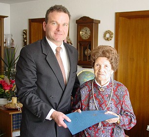 Unser Bild zeigt Liesel Henk mit Bürgermeister Bernhard Martin, der ihr die Urkunde des baden-württembergischen Ministerpräsidenten überreichte.