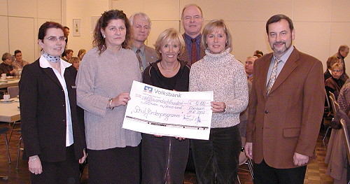 Volksbank Neckartal unterstützt 42 Schulen (V.l.) Sabine Heckel (Volksbank), Rosa Rojek (Meckesheim), Hugo Sablowski, Bruni Hitzfeld (Neckargemünd), Norbert Hofstetter, Claudia Rechnitzer-Erler (beide Eberbach) sowie Vorstand Friedrich Heuser bei der symbolischen Scheckübergabe. (Foto:Claussen)(jc) Gestern hatte die Volksbank Neckartal Schulleiterinnen und Schulleiter aus 42 Bildungseinrichtungen im Geschäftsgebiet "Serviceland" zum alljährlichen Adventskaffee ins Gasthaus "Zum Schwanen" nach Neckarsteinach eingeladen. Neben dem Gedankenaustausch standen Informationsbeiträge zum vielseitigen Engagement der Bank im schulischen Umfeld auf dem Programm. Wie Marketingleiter Hugo Sablowski im Beisein des Heidelberger Schulrats Fred Wingerter und Bankvorstand Friedrich Heuser betonte, möchte die Volksbank auch mit Sponsoring als wichtigem Bestandteil im Kommunikationsmix ihre Verbundenheit mit der Region dokumentieren und überreichte im Rahmen des Schulförderprogramms der Volksbank Neckartal einen symbolischen Scheck über 12.800 Euro. Allein im Jahre 2003 förderte die Bank 41 Schulen, 190 eingetragene Vereine und 13 Gewerbevereine mit über 72.000 Euro. Hinzukommen nochmals über 26.000 Euro aus den Zweckerträgen des Gewinnsparvereins, mit denen 59 Kirchengemeinden und 51 Kindergärten, sowie zwei abgebrannte Schulen unterstützt wurden.