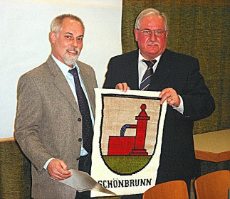 Das Gesamtgremium bedauere genau wie er selbst das Ausscheiden Meisingers sehr, so Bürgermeister Schilling, und danke ihm für seine geleistete Arbeit. Zusammen mit der Urkunde über das Ausscheiden überreichte Schilling ihm einen Wandteppich mit dem Wappen Schönbrunns und ein Weinpräsent als Dank, verbunden mit den besten Wünschen für Gesundheit und Zukunft.