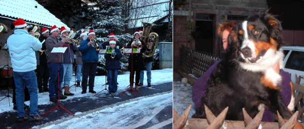 Ein ganz besonderer Zaungast Trotz winterlicher Temperaturen spielte die Blaskapelle "Kleiner Odenwald Allemühl" wieder in allen Schönbrunner Ortsteilen. In Allemühl lauschte Carlo der Weihnachtsmusik. (Fotos: Böhm)(ub) Mit wunderschön gespielten Weihnachtsliedern war die Blaskapelle "Kleiner Odenwald Allemühl" auch in diesem Jahr wieder in allen Schönbrunner Ortsteilen unterwegs.