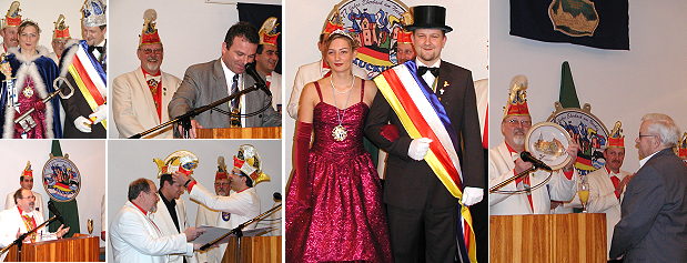 Jens und Nadja Müller regieren die Stadt im närrischen Jubiläumsjahr (Fotos:Claussen)(jc) Zu ihrem traditionellen Neujahrsempfang hatten die Narren der KG Kuckuck heute ins Rathaus geladen. Wie in jedem Jahr wurden wieder verdiente Karnevalisten geehrt. Wolfgang Backfisch, der seit Jahren die KG Kuckuck mit malerischen Einfällen unterstützt, bekam von Präsident Dieter Müller einen Ehrenteller überreicht. Regina Röth wurde von Rüdiger Klein, Bezirksvorstand der Vereinigung Badisch-Pfälzischer Karnevalsvereine, mit dem Verdienstorden ausgezeichnet. Michael Stellner wurde von Ralph Brenneis als neuer Elferrat eingeführt und Otto Hildenbrand stellte den aktuellen Kampagneorden vor. Der Orden greift das diesjährige Stadtjubiläum "777 Jahre Eberbach am Neckar" auf und wurde von Bernd Veith entworfen. Im Wahljahr mochte Bürgermeister Bernhard Martin seinen Rathausschlüssel nicht so bereitwillig übergeben wie in den Vorjahren. Ob er es ahnte oder nicht – ein echter Machtwechsel stand ihm nämlich dieses Mal ins Haus. Vom närrischen Stadtjubiläum inspiriert, hat die Karnevalsgesellschaft mit Jens und Nadja Müller ein Jubiläumsprinzenpaar aufgeboten um die Macht im Ratsgebäude zu erlangen. So konnte sich der Bürgermeister dem Griff nach der Macht schließlich doch nicht entziehen und musste seinen blaublütigen Nachfolgern den Rathausschlüssel übergeben. Die neuen Machthabern stellten dann auch unverzüglich ein umfangreiches Maßnahmepaket vor. Unter anderem ersetzt ab sofort der Elferrat den Gemeinderat und der Bürgermeister erhält Hausarrest. Im Büro des früheren Bürgermeisters werde ein Entbindungsstation eingerichtet, um den närrischen Nachwuchs in der Stadt sicherzustellen. Außerdem solle die Rosenbrauerei wieder aufgebaut werden. Zwei Kästen des Eberbacher Gebräus wurden zur Verköstigung durch die Bürger bereits mitgebracht. Anton Veith sprach die Laudatio auf das Prinzenpaar und überreichte Bilder mit Klapperstorchmotiven, um dem Wunsch nach blaublütigem Nachwuchs etwas Nachdruck zu verleihen.