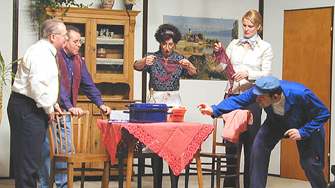 Theaterspaß in der ausverkauften Zwingenberger Mehrzweckhalle Gut unterhielten die Schauspieler des MGV Zwingenberg mit Frauenchor und Jugendsingkreis bei ihrem Theaterabend das Publikum in der Zwingenberger Mehrzweckhalle. Unser Foto zeigt eine Szene aus dem Stück "Hund oder Has?". (Foto: Baumgartner) (tb) Gestern lud die Theatergruppe des Männergesangvereines Zwingenberg mit Frauenchor und Jugendsingkreis zu einem Theaterabend ein. In der Mehrzweckhalle Zwingenberg präsentierte man zwei Komödien als Einakter. Gespannt war das Publikum auf die diesjährigen Aufführungen der Gruppe und wurde dabei nicht enttäuscht, da es viel zu lachen gab und die Zwingenberger Laienschauspieler über sich hinauswuchsen und zwei eine fehlerlose Vorstellungen ablieferten.