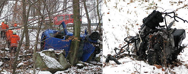Ein Schwerverletzter bei Unfall zwischen Unterdielbach und Eberbach (Fotos:Claussen)(jc) Auf winterlich glatter Fahrbahn der L524 verlor heute gegen 14.40 ein 18-jähriger aus Oberdielbach die Kontrolle über seinen VW Polo und wurde schwer verletzt. Aus einer Linkskurve, vom Wohnort kommend, kam der Führerscheinneuling über die Gegenfahrbahn auf das Kopfstück der Leitplanke und wurde, wie von einer Sprungschanze, die Böschung heruntergeschleudert. Dabei durchschlug er das Unterholz, ehe er etwa 20 Meter von der Fahrbahn entfernt an einem Baum hängen blieb. Der Aufprall war so heftig, dass der Motor aus dem Fahrzeug gerissen wurde und erst weitere 20 Meter entfernt auf einem Waldweg zum liegen kam. Der Fahrzeuglenker musste von der Eberbacher Feuerwehr aus dem Wrack befreit werden und nach notärztlicher Behandlung ins Eberbacher Kreiskrankenhaus eingeliefert werden. Die L524 war wegen Bergungsarbeiten zwischen Eberbach und Unterdielbach bis gegen 16.30 Uhr vollständig gesperrt.