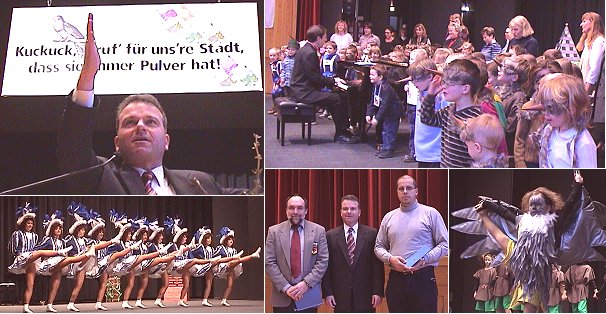 Eberbach huldigt seinem heimlichen zweiten Wappentier Der Bürgermeister dirigiert den Kanon, rechts die Kindergartenkinder beim Begrüßungslied. Unten v.l. die Prinzengarde, die geehrten Lebensretter Heinz-Jürgen Thöne und Marc Schneider sowie Anna Riedl als Kuckuck beim Tanz der Kuckuckskrümel. (Fotos:Richter)(hr) Mit fröhlichen Kuckucksliedern, begleitet von Achim Plagge am Klavier, begrüßten die Kinder der Eberbacher Kindergärten heute Vormittag die Gäste beim traditionellen Eberbacher Neujahrsempfang in der voll besetzten Stadthalle. Auch im weiteren Verlauf der Veranstaltung rückte der gefiederte Frühlingsbote immer wieder ins Rampenlicht. Den Grund dafür nannte Bürgermeister Bernhard Martin bei seiner Begrüßung: Vor genau 400 Jahren hatte nämlich der "Kuckucksprozess" stattgefunden, nachdem zuvor angeblich einem Eberbacher Arzt in einer Neckarwimmersbacher Wirtschaft ein Kuckuck anstatt einer gebratenen Taube serviert worden war. Seitdem tragen die Eberbacher ihren Spottnamen "Kuckucke", und der Vogel hat sich sozusagen zum "heimlichen zweiten Wappentier" gemausert.