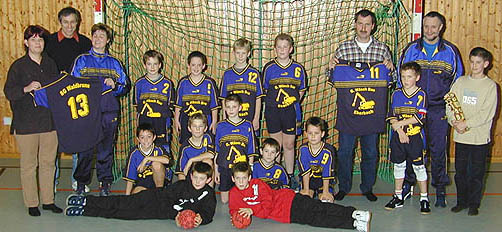 Firma Wäsch spendierte komplette Spielbekleidung Unser Foto entstand bei der Präsentation der neuen Trikots und zeigt die männliche E-Jugend der SG Waldbrunn in ihren neuen Trikots zusammen mit Sabine Wäsch (l.), Vorstand Rainer Ihrig (2.v.l.), Trainerin Petra Weis (3.v.l.), Abteilungsleiter Uwe Weis (2.v.r), und Achim Wäsch (4.v.r.). (Foto:privat)(tb) Einen neuen Satz Trikots samt der dazugehörigen Hosen erhielten gestern die jungen Handballer der männlichen E-Jugend bei der SG Waldbrunn. Die Spende kam vom Eberbacher Tiefbauunternehmen Günter Wäsch GmbH. Trainerin Petra Weis, Handball-Abteilungsleiter Uwe Weis und Vorstand Rainer Ihrig freuten sich bei der Übergabe mit den kleinen Handballern über die willkommene Spende. Vorstand Ihrig sagte dabei, dass solch eine Spende eine gute Sache für den Verein und die Jugendarbeit sei und bedankte sich bei Sabine und Achim Wäsch für Trikots und Hosen, mit denen die E-Jugend am 1.Februar in der Ittertalsporthalle erstmals spielen wird. Aus den Reihen der Jugend bedankte sich Spielführer Marvin Kaufmann mit einem Präsent.