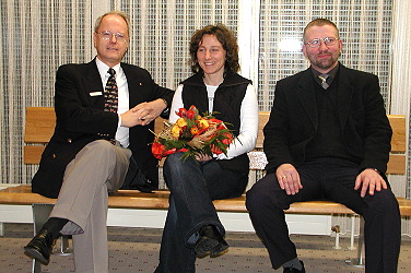 Beim Gewinnspiel des NeckarTalers eine solide Bank gewonnen Volksbank- Vorstandsvorsitzender Herbert Hinterschitt, Gewinnerin Anne Weihrauch und Bank- Konstrukteur Rudolf Wolf beim gemeinsamen Bank be- sitzen. (Foto:Claussen)