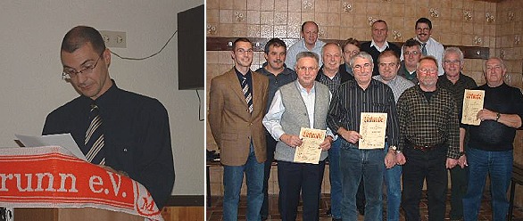 Dritter Vorstand und neuer Jugendleiter wurden gewählt Das erste Foto zeigt den Vorsitzenden Heckmann bei der Verlesung seines Jahresberichts und das zweite Foto zeigt die anwesenden Mitglieder, die für ihre langjährige Vereinstreue ausgezeichnet wurden. (Fotos: privat)