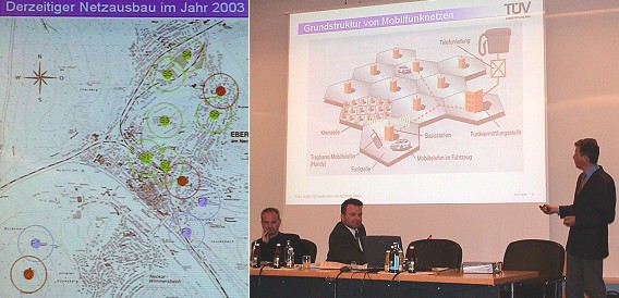TÜV-Gutachter nahm Mobilfunk-Standorte unter die Lupe Links bestehende und künftig mögliche Mobilfunkstandorte in Eberbach. Rechts Dr. Thomas Gritsch bei seinem Vortrag mit Bürgermeister Bernhard Martin (Mitte) und Stadtbaumeister Manfred Janner. (Repro/Foto:Richter)(hr) Gerade mal ein Dutzend interessierter Bürgerinnen und Bürger fand sich zusammen mit Gemeinderatsmitgliedern, Ortsvorstehern, Bezirksbeiräten und Mitarbeitern der Stadtverwaltung vorgestern Abend im Rathaus ein, um sich über das Eberbacher Standortkonzept für Mobilfunkanlagen zu informieren. Vor gut zwei Jahren hatte das Thema allein in Eberbach-Nord ein vielfach größeres und zumeist kritisches Publikum mobilisiert, als es um die geplante Errichtung einer Sendeanlage auf dem Turm der katholischen Kirche St.Josef in der Steigestraße ging (wir berichteten).
