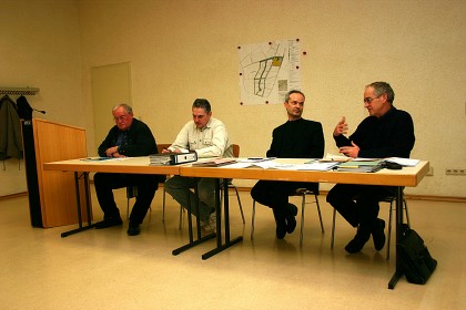 Bebauungsplanentwurf für GIP gebilligt Bürgermeister Schilling, Karl Wilhelm, Stadtbaumeister Manfred Janner und Albrecht Streng informierten in einer vorgezogenen Bürgerbeteiligung interessierte Schönbrunner Bürger detailliert über die Planungsinhalte des Gewerbeparks (Foto: Böhm)(ub) Der Interkommunale Gewerbepark der vereinbarten Verwaltungsgemeinschaft (vVG) Eberbach-Schönbrunn nimmt allmählich Formen an. Nachdem nun der Bebauungsplanentwurf des "GIP- Teil Süd-Ost" am Freitag auch im Schönbrunner Gemeinderat genehmigt wurde, steht dem geplanten Grundstückserwerb nichts mehr im Wege. Einwendungen können nur noch von betroffenen Grundstückseigentümern oder Trägern öffentlicher Belange erhoben werden.