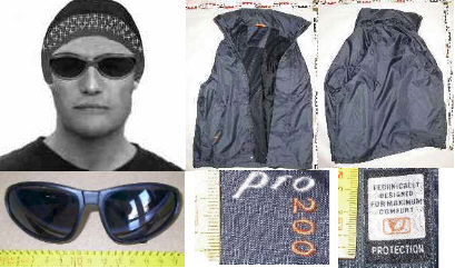 Phantombild des Täters erstellt sowie Teile der Kleidung gefunden Phantombild des Täters, sowie dessen Jacke (Detailausschnitte markanter Stellen) und seine Sonnenbrille. (Fotos:Polizeidirektion HD)(lct) Am Donnerstag, den 29.01.04 überfiel ein bisher unbekannter Täter gegen 16.55 Uhr die Filiale Schönbrunn der Sparkasse Neckartal-Odenwald (wir berichteten). Er bedrohte die alleine anwesende Bankangestellte mit einer Waffe, die er in der Tasche verborgen hielt und forderte Bargeld.