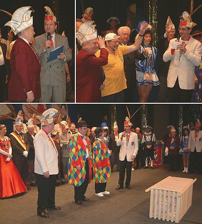 Ein lebendes Schwein , das sich in seinem Transportbehälter sichtlich wohlfühlte, konnten Christl Obernosterer und Hermann Beisel als Vertreter der "Wiesensträßler" aus der Hand des Präsidenten Dieter Müller und des Sitzungspräsidenten Ralph Brenneis entgegennehmen. Als Anerkennung von der KG Kuckuck für das 40 jährige Bestehen. Die Anwohner der Wiesenstraße mit ihren Freunden sind eine besonders rührige Gruppe in der Eberbacher Fastnacht, die sich Dank ihrer Aktivitäten bei Umzügen und Veranstaltungen in der näheren Umgebung großer Beliebtheit erfreut. Durch ihre Teilnahme bei den Mainzer Karnevalsumzügen haben die "Wiesensträßler" Eberbach und die hiesige Fastnacht aber auch überregional bekannt gemacht.