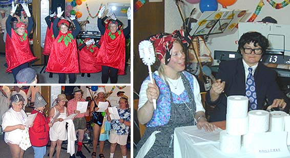 Wer will lustige Handwerker sehn? Der Achterrat als Tomaten beim Ketchup-Tanz, "Was bin ich" mit Toilettenkosmetikerin Clothilde Saubermann (Annette Lenz) und Robert Lemke (Brigitte Hilbers), sowie die Montagsturnerinnen bei der Hosenmodenschau. (Fotos:Baumgartner)(tb) "Wer will lustige Handwerker seh`n, der muss zu uns ins Sportheim geh`n!" hieß es bei der 7. Dielbacher Frauenfastnacht am schmutzigen Donnerstag, als pünktlich um 20.11 der Achterrat nach der gleichnamigen Melodie in das wieder einmal toll geschmückte Sportheim einzog. Sie kamen nach dem Motto als Koch, Maler, Metzger, Gärtner, Elektriker, Zimmermann, Schreiner und Maurer - alles Berufe aus heimischen Gefilden.
