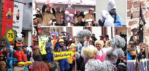 Tausende beim längsten Fastnachtsumzug der Region (Fotos:Claussen)(jc) Standesgemäß präsentierte sich heute wieder Eberbachs hessisches Nachbarstädtchen Hirschhorn als Fastnachtshochburg Nummer eins im Neckartal. Trotz unnachgiebigem Nieselregen säumten tausende Hirschhorner und Gäste aus der Region die Zugstrecke. Zahlreiche Fußgruppen, Musikkapellen und Motivwagen ließen wieder einmal über 100 Zugnummern zusammenkommen. Gleich mehrmals wurde das "Dschungelcamp" auf die Schippe genommen. Die eigens für die Narren angeordnete Öffnung des Straßentunnels konnte nicht beschwichtigen, hier war ein Modell nebst großer Baumannschaft mit von der Partie. Weitere Motive stellten Geopark, Steuer- und Gesundheitsreform, McDrive sowie regionale Themen aller Art.