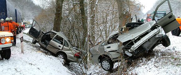 Mit der Beifahrerseite an einen Baum geprallt (Fotos:Richter)(hr) Tödlich endete heute gegen 12.40 Uhr ein Unfall für einen 39-jährigen Erbacher auf der Bundesstraße 45 zwischen Eberbach und Gammelsbach. Mit seinem Opel Vectra fuhr der Mann in Richtung Gammelsbach, als er in einer leichten Linkskurve vermutlich ins Schleudern geriet, nach links von der Fahrbahn abkam und mit der rechten Fahrzeugseite gegen einen Baum prallte. Der Fahrer war sofort tot.