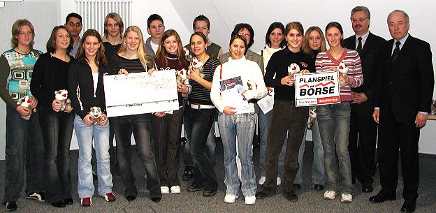 Spielgruppe Quartett auf dem Spitzenplatz Die erfolgreichen Schülerinnnen und Schüler des Hohenstaufen- Gymnasiums mit Sparkassendirektor Wolfgang Kleeberger und Schulleiter Helmut Schultz (Foto:Claussen)(jc) Der Einladung zur Siegerehrung und Preisverleihung zum Planspiel Börse der Sparkasse Neckartal- Odenwald im Teilmarkt Eberbach waren heute zahlreiche Schülerinnen und Schüler sowie Schulleiter Helmut Schultz und Rotraut Cser vom Hohenstaufen- Gymnasium Eberbach gefolgt. Direktor Wolfgang Kleeberger zeigte sich über die rege Teilnahme erfreut und nahm nach kurzer Rückschau die Siegerehrung vor. Circa 80 Schülerinnen und Schüler des Hohenstaufen- Gymnasiums beteiligten sich am 21. Planspiel Börse im Teilmarkt Eberbach. Alle Spielgruppen waren mit einem fiktiven Kapital von 50.000 Euro ausgestattet und konnten mit 150 handelbaren Wertpapieren an den Börsenplätzen Frankfurt, Paris, Mailand, Madrid und Wien agieren. Über 92 Prozent aller Teilnehmer haben dabei von den technischen Möglichkeiten des Internets Gebrauch gemacht.