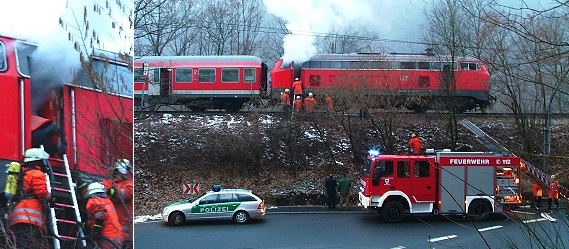 Diesellok mächtig unter Dampf (Fotos:Richter)(hr) Glimpflich verlief heute Morgen ein Brand in einem Nahverkehrszug der Deutschen Bahn. Dem Lokführer fiel auf der Fahrt zwischen Eberbach und Gaimühle zunächst auf, dass die Diesellok an Zugkraft verlor. Kurz darauf bemerkte er Rauch im Führerhaus und stoppte den Zug vor dem ehemaligen Bahnhof Gaimühle.