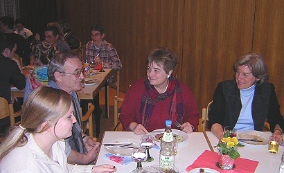 Diesmal wurden die ehrenamtlichen Helfer bedient Die "guten Geister" der Pfarrei feierten ein heiteres Fest im Pfarrheim St. Johannes Nepomuk. (Foto:privat)(tw) (go) Jede Gemeinschaft kann nur funktionieren, wenn sie genügend Mitglieder hat, die Ihre eigene Zeit und Kraft in den Dienst dieser Gemeinschaft stellen. Pfarrer Hubert Seitz von der katholischen Pfarrei St. Johannes Nepomuk betonte in seinen einleitenden Worten anlässlich des Begegnungsfestes der Ehrenamtlichen, dass sich viele Gemeindemitglieder in der Pfarrei die Anliegen der Kirche zu ihren eigenen machen. Das "Begegnungsfest der Ehrenamtlichen" am Sonntag, dem 29. Februar im Katholischen Pfarrheim fand zum ersten Mal statt. Vorausgegangen war diesem Pilotprojekt ein schon lange gehegter Plan der vier Hauptamtlichen, Pfarrer Hubert Seitz, der beiden Pastoralreferenten Sabine und Andreas Bohnert sowie Bezirkskantor Godehard Weithoff, alle ehrenamtlich Tätigen zum besseren Kennenlernen, zum gemeinsamen Gespräch und zum Essen einzuladen. Sehr schnell wurde klar, dass es aber für die Gruppe der Ehrenamtlichen nicht wieder zu den notwendigerweise zu leistenden Arbeiten kommen durfte, wie Essen und Trinken bestellen, Tische und Stühle stellen, eindecken und Küchenarbeit, Aufräumen und Geschirr spülen. Deshalb hatten die Hauptamtlichen diese Arbeiten unter sich verteilt und den Gästen "ausdrücklich verboten", wie es Sabine Bohnert in der Vorstellungsrunde der ca. 90 Personen launig bemerkte. Manch einer musste erstaunt feststellen, dass es in "seiner Pfarrgemeinde" noch Gruppierungen gibt, von denen er bisher nichts wusste, und dass das Pfarrheim mit Sicherheit zu klein wäre, wenn tatsächlich alle, die eine Aufgabe übernehmen, gekommen wären. So geriet dieser Abend zu einem heiteren Begegnungsfest, in dessen Verlauf Bezirkskantor Godehard Weithoff seine eigenen Beobachtungen des Ehrenamtes in einen für diesen Tag geschriebenen Song mit Klavierbegleitung kleidete, in dessen Refrain zum Schluss alle einstimmen konnten: "Ich hab ein Ehrenamt in unsrer Pfarrei..."