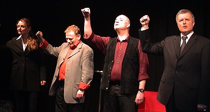 Mannheimer Kabarett-Profis legen VETO ein (Foto:Richter)(hr) Gleich im Doppelpack gastiert das Mannheimer Kabarett "Dusche" heute und morgen in Eberbach. Das Kulturlabor hat das bissige und wortgewaltige Kabarett-Ensemble in die Galerie ARTgerecht geholt. Wie nicht anders zu erwarten, gehen Hans Georg Sütsch, Klaus-Jürgen Hoffmann, Josefin Lössl und Wolfgang Schmitter (Foto v.l.) auf ihre Weise mit den politischen und gesellschaftlichen Verhältnissen hierzulande ins Gericht. "Veto" betiteln sie Ihr aktuelles Programm und nehmen damit den Zeitgeist auf die Schippe. Themen sind der Niedergang der SPD, ein Crash-Kurs in Konsumverweigerung, der große Lauschangriff, Steuerflucht oder die Überalterung der Gesellschaft. Aber auch die US-Präsident George Bush bekommt sein Fett ab: Die Mannheimer stellen ihn als dekadenten römischen Imperator dar.