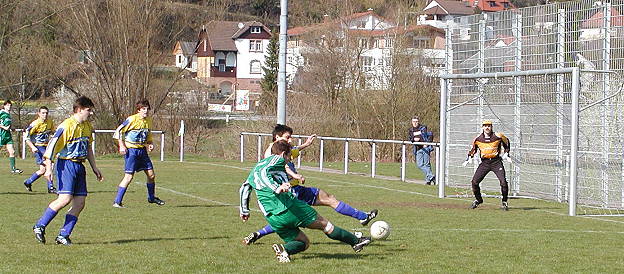 Unglückliche Niederlagenserie reißt nicht ab (Foto:Claussen)(jc) Der mit drei Pünktchen am Tabellenende der Kreisliga A abgeschlagene VfB Eberbach kassierte gestern in der Au eine weitere unglückliche Niederlage. Man unterlag dem SC Mönchzell mit 1:2. Jens Vettermann traf nach einer halben Stunde für die Gäste. Kurz nach dem Seitenwechsel war es Sascha Schramm, der den Ausgleich für Eberbach markierte. Kurz vor Spielende dann aber wieder das gewohnte Bild. Fünf Minuten vor dem Schlusspfiff markierte Oliver Hilbert den Siegtreffer für Mönchzell.