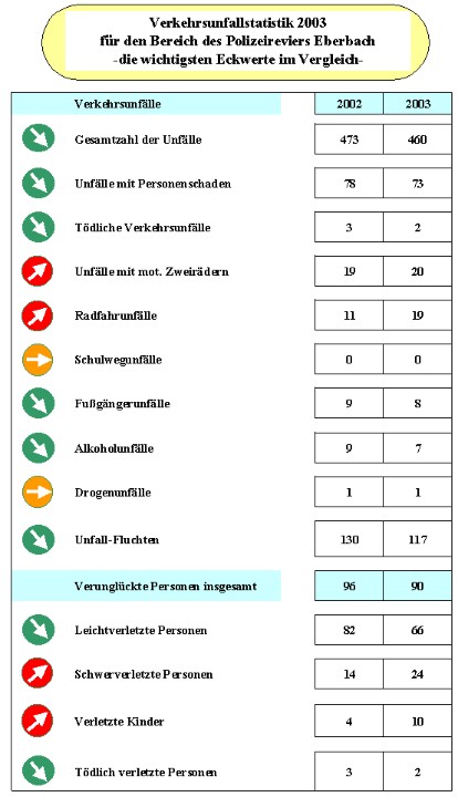 Unfallbilanz 2003: Zwei Tote und 90 Verletzte (Grafik:Polizei)(hr) (pol) Die Verkehrsunfallbilanz veröffentlichte dieser Tage die Eberbacher Polizei für ihren Zuständigkeitsbereich. 2003 wurden auf den Straßen der Stadt Eberbach 401(Vorjahr 416), der Gemeinde Schönbrunn 52(50) und der Gemeinde Heddesbach 7(7), zusammen 460(473) Verkehrsunfälle aufgenommen. Bei 73 Unfällen davon waren Personenschäden zu beklagen, zwei sogar mit tödlichen Folgen (in beiden Fällen handelte es sich um Motorradfahrer). Insgesamt wurden 90 Menschen verletzt, 24 davon schwer.