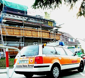 Arbeitsunfall im Panoramaweg (Foto:Richter)(hr) Schwere Kopf- und Rückenverletzungen erlitt ein Mitarbeiter einer Holzbaufirma aus Buchen heute Vormittag im Panoramaweg. Bei Arbeiten auf dem Dachboden eines Wohnhauses geriet der 43-Jährige versehentlich auf die geschlossene Dachbodentreppe. Diese öffnete sich plötzlich durch das Körpergewicht, wodurch der Mann auf den Steinfliesenboden des darunterliegenden Geschosses stürzte.