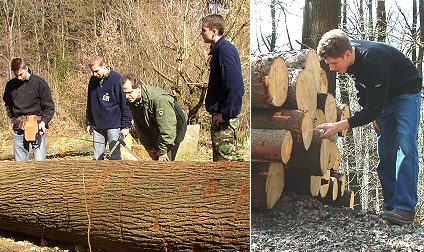 Berufsorientierung in der Forstwirtschaft Linkes Bild: Die Schüler Cristoph Ziegler (l.) und Andreas Casado (r.) mit dem Forststudenten Sven Ihrig (2.v.l.) und Förster Siegfried Riedl bei der Rundholzsortierung. Rechtes Bild: Carsten Berres bei der Aufnahme von Stammholz. (Fotos:StVE/Richter)(hr) Im Rahmen der Berufserkundung absolvieren zurzeit Schülerinnen und Schüler der 10.Klassenstufe des Hohenstaufengymnasiums Eberbach einwöchige Praktika in verschiedenen Betrieben und Einrichtungen der Region.