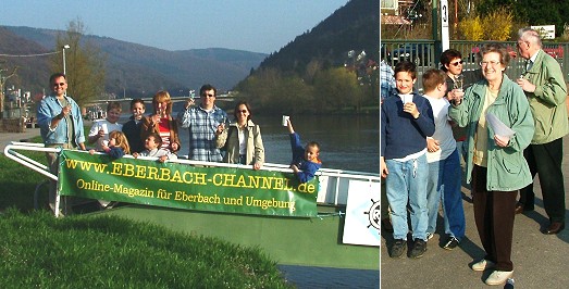 Fähre bleibt in städtischen Händen (Fotos:Richter)(jc) Einen kleinen Aprilscherz erlaubte sich gestern die Redaktion unseres Online-Magazins mit der Meldung "Fähre wird privatisiert". Natürlich wird die italienische Fährgesellschaft Moby-Lines S.p.A. den Frischling nicht übernehmen und ihren Verbindungen vom italienischen Festland auf die Mittelmeerinseln Sardinien, Korsika und Elba ihre Aufmerksamkeit schenken. Der sympatische „Familienclan Soprano“ existiert wahrscheinlich auch nur in einer recht anspruchsvollen Mafia- Fernsehserie. Deshalb musste auch die angekündigte Bootstaufe abgesagt werden. Am Fähranleger schenkten allerdings Mitarbeiter des EBERBACH-CHANNEL zur angekündigten Zeit Sekt bis zum abwinken aus, was die gekommenen Gäste auch gerne in Anspruch nahmen.