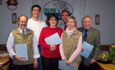 Dem Gedenken an die im vergangenen Jahr verstorbenen Mitglieder schloss sich die Ehrung langjähriger DLRG Mitglieder an. So konnte Heinz Thöne zahlreiche Ehrenurkunden und die Ehrennadel persönlich überreichen: Für ihre 10-jährige Mitgliedschaft wurden Monika Mayer und Joachim Deininger geehrt. Seit 25 Jahren halten Annette Willert-Simon, Dieter Jeitner und Martin Handbauer der DLRG die Treue. Im Laufe diesen Jahres werden Rainer Hofmayer und Theodor Wäsch für 40 Jahre Mitgliedschaft geehrt und Dr. Irmgard Schneller erhält für 65 Jahre bei der DLRG eine verdiente besondere Ehrung.