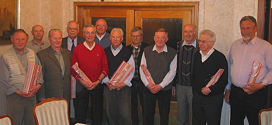 160 Jahre MGV Liederkranz Die für regelmäßigen Besuch der Chorproben ausgezeichneten Sänger des MGV Liederkranz: Franz Szedlak, Irimbert Goebel, Dr. Heinrich Gaa, Eckart Sprenger, Albert Fallert, Günter Raab, Helmut Lumpp, Karl Bracht, Hans Reibel, Josef Mathias, Friedrich Wäsch und Robert Löffler. Es fehlt Willi Storch. (v.l.) (Foto: privat)