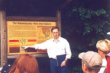 Ab April wieder Führungen auf dem Weg der Kristalle am Katzenbuckel Das Foto zeigt Diplom-Mineraloge Dr. Andreas Landmann auf dem Weg der Kristalle. (Foto: privat)(bro) Die Gemeinde Waldbrunn bietet auch in diesem Jahr wieder Führungen auf dem "Weg der Kristalle" am Katzenbuckel an. Auf Initiative des Diplom-Mineralogen Dr. Andreas Landmann aus Sinsheim wurde gemeinsam mit dem Arbeitskreis Touristik-Freizeit-Erholung und der Gemeinde Waldbrunn ein mineralogischer Lehrpfad am Katzenbuckel angelegt und mit Hinweistafeln des Naturparks Neckartal-Odenwald ausgestattet. Die Einweihung erfolgte bereits im Oktober 2001. Seitdem werden jährlich von April bis November Führungen angeboten. Den interessanten und anschaulichen Ausführungen von Dr. Landmann im Bezug auf die einzigartige Geologie des Katzenbuckels ist es zu verdanken, dass diese Führungen nicht zuletzt auch bei Kindern sehr beliebt sind und steigende Teilnehmerzahlen verzeichnet werden können. Im Jahr 2004 finden die Führungen an folgenden Terminen jeweils sonntags von 14 bis 16 Uhr statt: