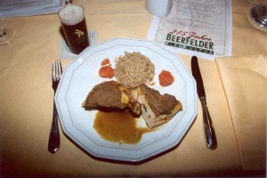 Kochen mit Bier - Würze für feine Speisen Beerfelder Hähnchenbrustfilet mit Bärlauch gefüllt in Treberkruste auf Malzbier-Honigsoße und Graupen-Gemüserisotto mit einem Dunkelbier.(Foto:Touristinfo)(jc) (kj)Kulinarische Aktionen gewinnen bei Urlaubern, Gästen wie auch bei der einheimischen Bevölkerung immer größere Bedeutung. Dabei ist besonders die Vermarktung regionaler Produkte mit eingebunden. Da liegt nahe, dass die Gastronomie mit Erzeugnissen aus der Region solche Aktionen anbietet. So jetzt auch wieder die Wirte in der südhessischen Urlaubsregion "Beerfelder Land", die nun schon zum vierten Mal im Frühjahr zu den "Beerfelder Bierwochen" einladen. Der Grundstein für diese Kooperationen wurde vor sechs Jahren mit den "Wildwochen im Beerfelder Land" gelegt. Als Frühjahrsaktion entwickelte vor drei Jahr die heimische Privatbrauerei Felsenkeller in Beerfelden eine weitere Aktion –die Bierwochen. Das Bier nicht nur als Getränk zu schätzen ist, werden die Gastronomen aus dem Beerfelder Land bei den "4. Beerfelder Bierwochen" vom 23. April bis 9. Mai 2004 erneut beweisen. In Zusammenarbeit mit der Tourist-Information Beerfelder Land werden acht Gastronomen aus Beerfelden, Rothenberg und Sensbachtal gemeinsam mit der Privatbrauerei Felsenkeller die Kochkunst bei der Eröffnung und bei der Aktion vorstellen und servieren.