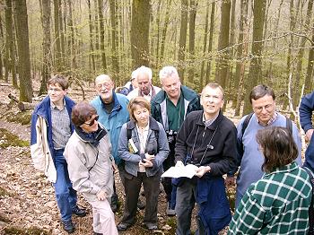 Jahresauftaktexkursion zum Bannwald in Eberbach (Foto:privat)(jc) (balo) Heute führte der NABU – Eberbach seine erste Exkursion 2004 durch. Sie führte unter der fachkundigen Führung von Dr. Max Schulz und Claudia Leitz zum Bannwald am Kleinen Imberg. Seit 1998 darf in dem 60 Hektar großen Gebiet keine Veränderung mehr vorgenommen werden. Man will den Wald sich selbst überlassen und seine Entwicklung beobachten. Die Teilnehmer der Exkursion konnten sehen, dass mittlerweile in dem Gebiet der Birkenbestand zurückgeht und sich verstärkt Fichten ansiedeln. Da man aber die Entwicklung über Jahrzehnte beobachten will, kann man zum jetzigen Zeitpunkt noch keinen so großen Unterschied zum benachbarten Wald feststellen. Als besonderer Höhepunkt hörte man an diesem Morgen den Ruf des Kolkraben.