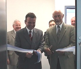 Unser Bild zeigt Landrat Dr.Jürgen Schütz (rechts) mit Bürgermeister Bernhard Martin beim symbolischen Durchtrennen des Bandes zur neuen Intensivstation. Links im Hintergrund Direktor Klaus Eiermann von der Krankenhausverwaltung.