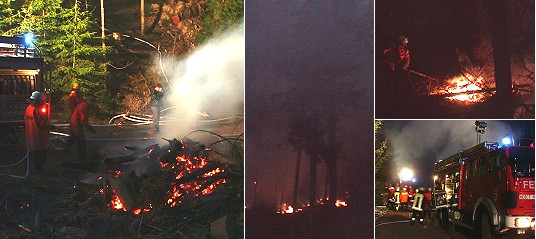 Länderübergreifender Großeinsatz der Feuerwehren (Fotos:Richter)(hr) Ein Waldbrand im "Kurzen Tal" bei Friedrichsdorf hielt heute Abend die Feuerwehren aus Eberbach, Hesseneck, Sensbachtal und Beerfelden in Atem. Ausgehend von einem großen Reisighaufen war rund ein Hektar Waldboden in einem Nadelholzbestand an mehreren Stellen in Brand geraten. Die Feuerwehrleute bekämpften die Brandnester zunächst mit Feuerpatschen und Wasser aus den Tanklöschfahrzeugen, mussten aber zusätzlich eine mehr als 2000 Meter lange Förderleitung von der Itter bis zum Brandort legen. Der Brand war nach etwa einer Stunde unter Kontrolle. Von der Freiwilligen Feuerwehr Eberbach waren auch mehrere Ortsteilwehren an den Löscharbeiten beteiligt. Hessenecks Bürgermeister Thomas Ihrig machte sich vorort ein Bild der Lage.