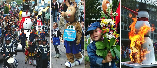 Winter mit Feuersbrunst verabschiedet (Fotos:Richter)(hr) Mit etwas weniger Zuspruch als in den Vorjahren aber dennoch mit guter Beteiligung vor allem der Katholischen Kindergärten fand der heutige Sommertagsumzug statt, den der Bürger- und Heimatverein in bewährter Manier organisiert hatte. Begleitet vom Fanfarenzug und der Katholischen Pfarrkapelle zogen die Kinder und Erwachsenen mit gebastelten Sommertagsstecken vom Turnplatz durch Bahnhofstraße, Hauptstraße, Kellereistraße und Friedrich-Ebert-Straße zur Gewerbeschule, auf deren Areal wie immer symbolisch der Winter in Form eines großen Schneemanns aus Pappmaché verbrannt wurde. Bevor Bürgermeister Bernhard Martin allerdings das Streichholz an den weißen Mann hielt, lud der 1.Vorsitzende der Bürger- und Heimatvereins, Günter Lipski, noch zum Frühlingsliedersingen ein. Weil die Firma mit der Tonanlage nicht gekommen war, musste sich Lipski über ein Megafon der Polizei verständlich machen. Die Kinder, die Gedichte vortragen wollten, erhielten ihre Dankesurkunden unverrichteter Dinge. Nachdem sich der Winter lodernd verabschiedet hatte, gab es für jedes Kind noch eine Sommertagsbrezel, die die einheimischen Bäcker und der Bürger- und Heimatverein gestiftet hatten.