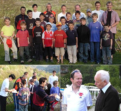 Miniadler der Skizunft Katzenbuckel trafen Nationalmannschaft V.l.: Alexander Herr, Martin Schmitt, Michael Uhrmann, Stephan Hocke, Maximilian Mechler, Georg Späth und Uli Schöpwinkel, u.r. Bundestrainer Wolfgang Steiert (l.) im Gespräch mit Hans Klinge. (Fotos:Claussen)(jc) Derzeit weilt die deutsche A-Nationalmannschaft der Skispringer in Eberbach zum Leistungstest im Reha-Zentrum Neckar-Odenwald. Am Rande der zweitägigen Leistungsüberprüfung sind Martin Schmitt, Alexander Herr, Michael Uhrmann, Stephan Hocke, Maximilian Mechler und Georg Späth mit Bundestrainer Wolfgang Steiert heute an deren Unterkunft, dem Hotel "Neckarblick", mit den Miniadlern der Skizunft Katzenbuckel zusammengetroffen. Auf Vermittlung von Hans Klinge vom "Neckarblick" und Jürgen Wolff vom Reha-Zentrum gaben die sympathischen Weltklasse- Athleten Autogramme und nahmen sich nach einem anstrengenden Tag noch Zeit für das eine oder andere Erinnerungsfoto. Miniadler-Betreuer Uli Schöpwinkel bedankte sich beim DSV-Team und war sich sicher, dass dieses Treffen für die kleinen Skispringer ein weiterer Ansporn sein wird. Die Skizunft trainiert seit dem vergangenen September mit den Nachwuchsspringern am Jugend-Leistungszentrum für Ski Nordisch am Katzenbuckel. Die dortige Anlage wurde erst kürzlich mit einer modernen Keramik-Spur ausgestattet.