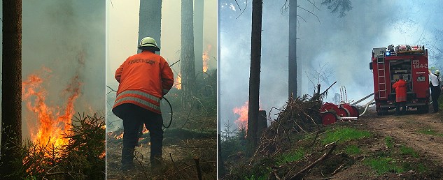 Waldbrand bei Rockenau (Fotos:Richter)(hr) Ein Waldbrand im Eberbacher Stadtwald bei Rockenau hielt heute Nachmittag die Feuerwehren aus Eberbach, Zwingenberg und Neunkirchen in Atem. Eine seit Tagen nicht mehr befeuerte Brandplatte mit Borkenkäfer-Reisig oberhalb der Schleuse Rockenau entzündete sich, und das Feuer sprang auf die bergseitige Wegböschung über. Dort fand es auf dem trockenen Waldboden und in der Fichten-Naturverjüngung reichlich Nahrung und breitete sich rasch über eine Fläche von rund zwei Hektar aus.