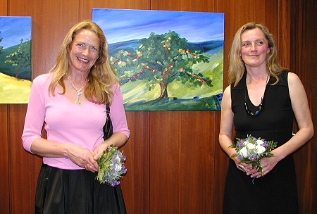 Sichtweiten - Kontrapunkte der Malerei bei der Volksbank Neckartal Gabriele Rupp-Bär (l.) und Ruth Schuh bei der gestrigen Vernissage in der Volksbank- Hauptstelle. (Foto:A.Claussen)(jc) Gestern wurde in der Hauptstelle der Volksbank Neckartal eine Ausstellung mit Bildern von Gabriele Rupp-Bär und Ruth Schuh unter dem Titel "Sichtweiten-Farbräume-Landschaften" eröffnet, zu der Vorstandsvorsitzender Herbert Hinterschitt zahlreiche Gäste begrüßen konnte. Minsterialdirektor a.D. Dr. Hans Heidler aus Binau führte in die Werke der beiden Künstlerinnen ein.