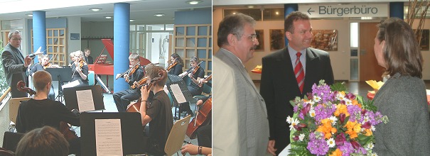 Zeichnung, Malerei, Collage - Ausstellung mit Werken von Ludwig Schmeisser Das Kammerorchester der Musikschule untermalte die Vernissage mit Passagen aus Georg Friedrich Händels Wassermusik. Ludwig Schmeisser(l.), Bürgermeister Bernhard Martin und der Kunsthistorikerin Ursula Bickelmann-Aldinger. (Fotos:Wörner)(tw) Seit gestern Morgen kann man sich im Eberbacher Rathaus die Werke von Ludwig Schmeisser betrachten. Auf drei Ebenen hat der Künstler eine bemerkenswerte Anordnung mit Arbeiten aus den achtziger Jahren und der darauf basierenden Werkgruppen mit Arbeiten der letzten Jahre getroffen (wir berichteten).