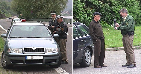 Dickes Ausrufezeichen gegen Raserei Linkes Bild: Gerd Lipponer und Egon Link (v.l.) bei einer Fahrzeugkontrolle, rechts Albert Ernst im Informationsgespräch mit einem Verkehrsteilnehmer. (Fotos:C.Richter)(hr) (cr) Rund 35 Beamte des Polizeireviers Eberbach und der Verkehrspolizei Heidelberg sind im Zuge einer Aktions-Woche seit Montag in und um Eberbach aktiv, um Raser zu entlarven. Statistiken belegen, dass immer mehr Verkehrsunfälle aufgrund überhöhter Geschwindigkeit passieren. Bei vielen Unfällen durch Raserei gab es in den vergangenen Jahren Schwerverletzte, einige Unfälle endeten tödlich. Grund genug für die Polizei, wieder eine Geschwindigkeitskontrollaktion auf Eberbachs Straßen durchzuführen. Dabei geht es zwar auch um andere Verkehrsdelikte und um die Verkehrssicherheit der Fahrzeuge, inbesondere der LKWs. Ein besonderes Augenmerk legen die Beamten aber vor allem auf Zweiradfahrer - zeigt doch hier die Erfahrung, dass schönes Wetter und eine kurze Gerade schon mal zu Geschwindigkeiten um die 200 km/h einladen können.