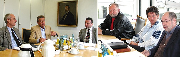 Zwei Drittel der Teilnehmer wieder auf dem Arbeitsmarkt vermittelt Links: Günter Schmidt (Mitte) erläutert den Abschlussbericht. Rechts: Claudia Lenz mit ihren beiden ehemaligen Kollegen. (Fotos:Claussen)(jc) Die Transfergesellschaft "Mypegasus" hat heute im Rahmen eines Pressegesprächs im Rathaus ihren Abschlussbericht in Sachen "Semecs" vorgelegt. Mypegasus hatte nach der Insolvenz des Herstellers elektronischer Baugruppen, im Frühjahr 2002, 366 Mitarbeiter des Eberbacher Werkes zur Vermeidung von Arbeitslosigkeit und Rettung des Standortes in die Transfergesellschaft übernommen.